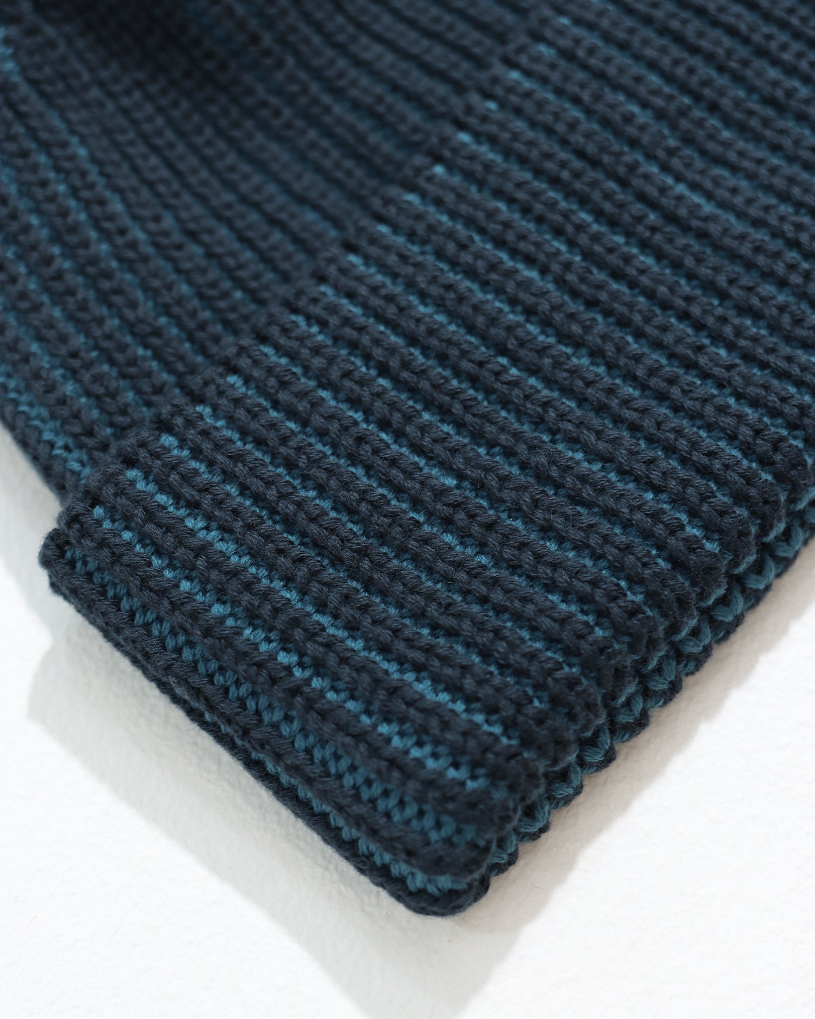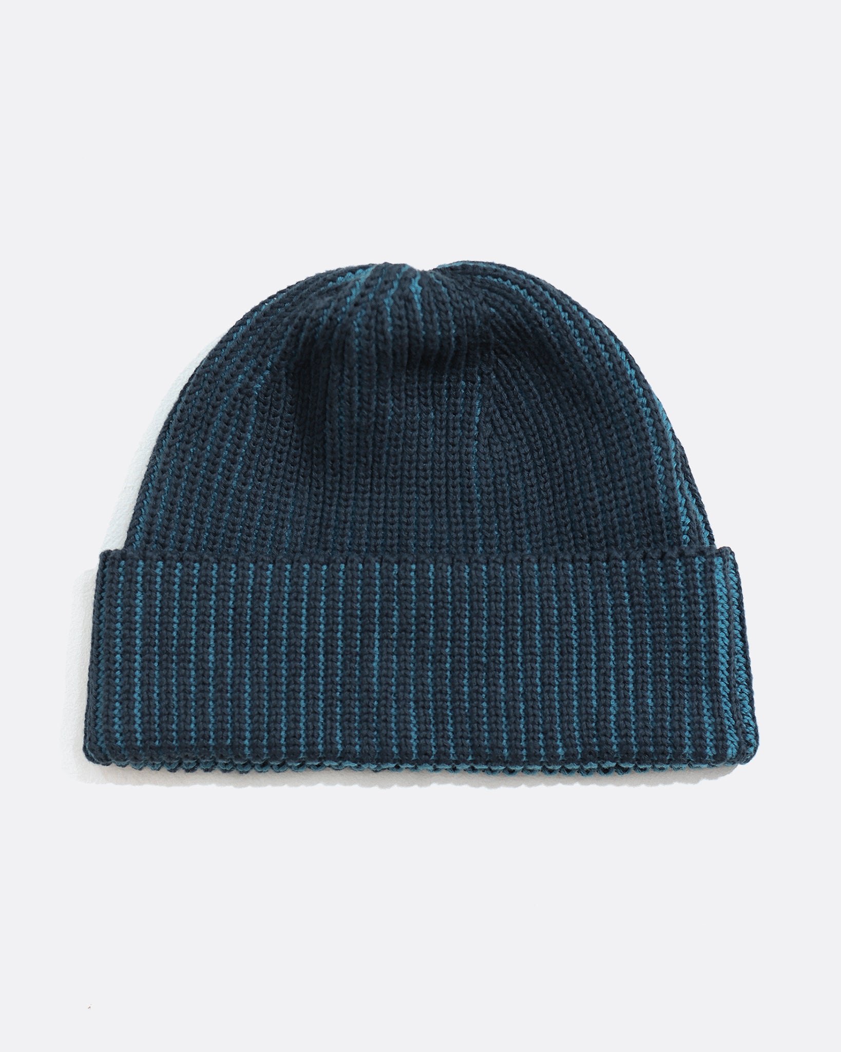 A beanie in organic cotton, knitted in a fisherman rib with a two-tone finish. A fine flash of contrasting colour runs between each rib, creating a striped effect that reveals itself on closer inspection.