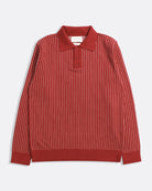 A long-sleeve midweight knit polo defined by bold vertical pinstripes and clean contrast trims at the cuffs, hem, and three-button placket. Its sharp Anglo-Italian character nods to tailoring traditions, brought to life in soft organic cotton. Pulled from our early archives after years off the roster, it returns with a fresh perspective, as sharp as when first conceived.