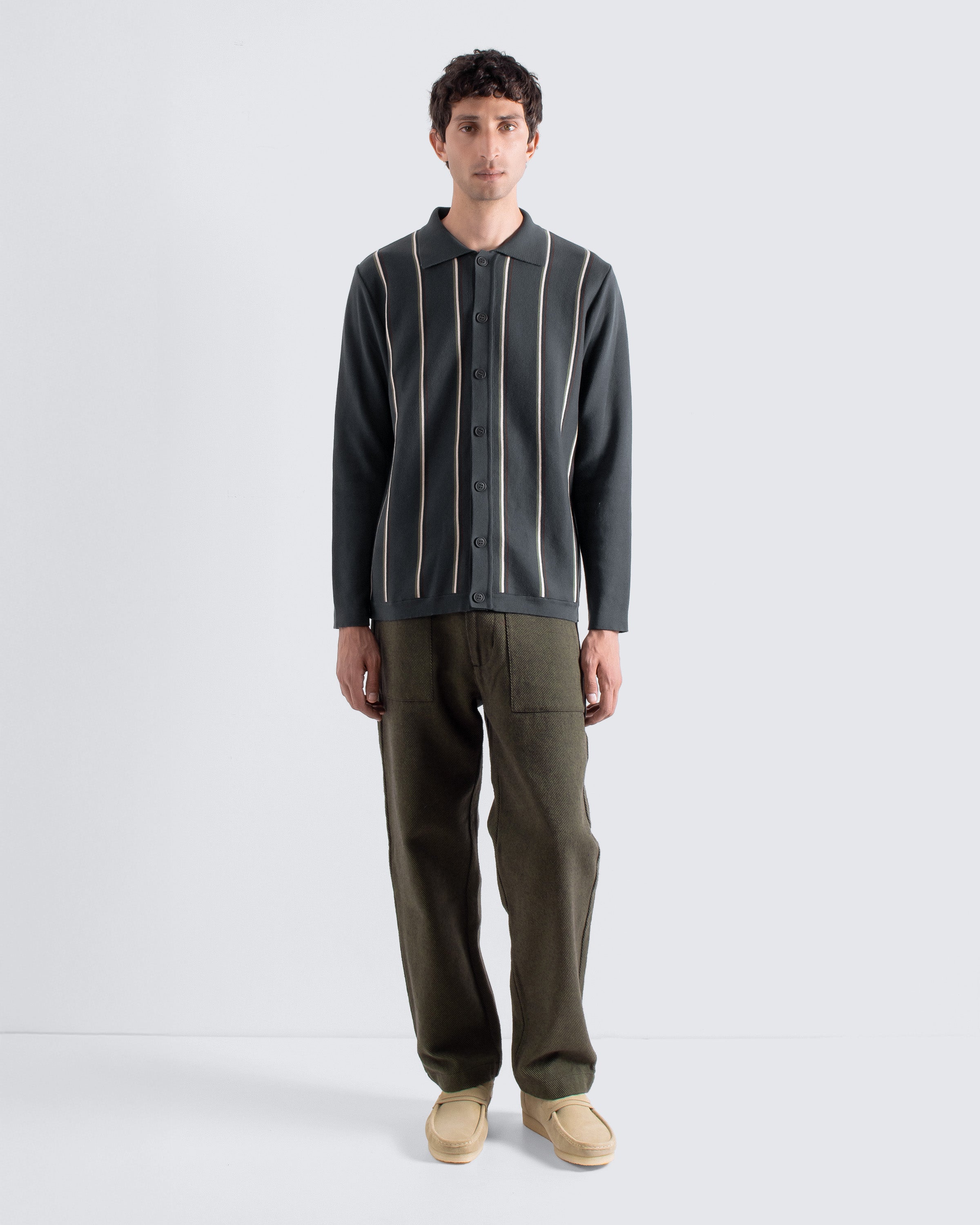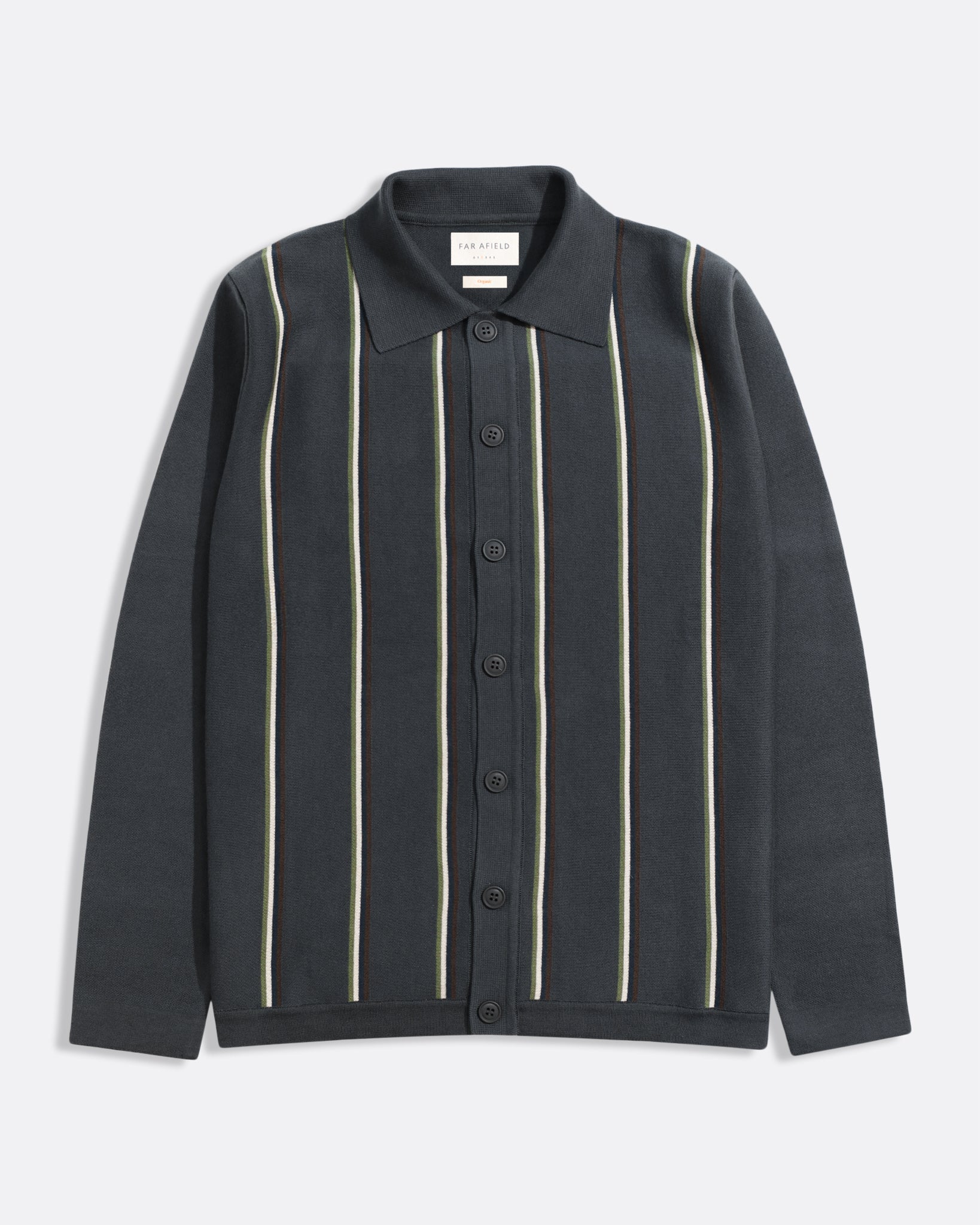A staple silhouette, revisited each season with fresh pattern and purpose. Knitted from midweight organic cotton with a crisp, structured feel. Features engineered stripes with careful spacing and contrast, referencing vintage shirting, record sleeves, and the clean lines of modernist furniture.