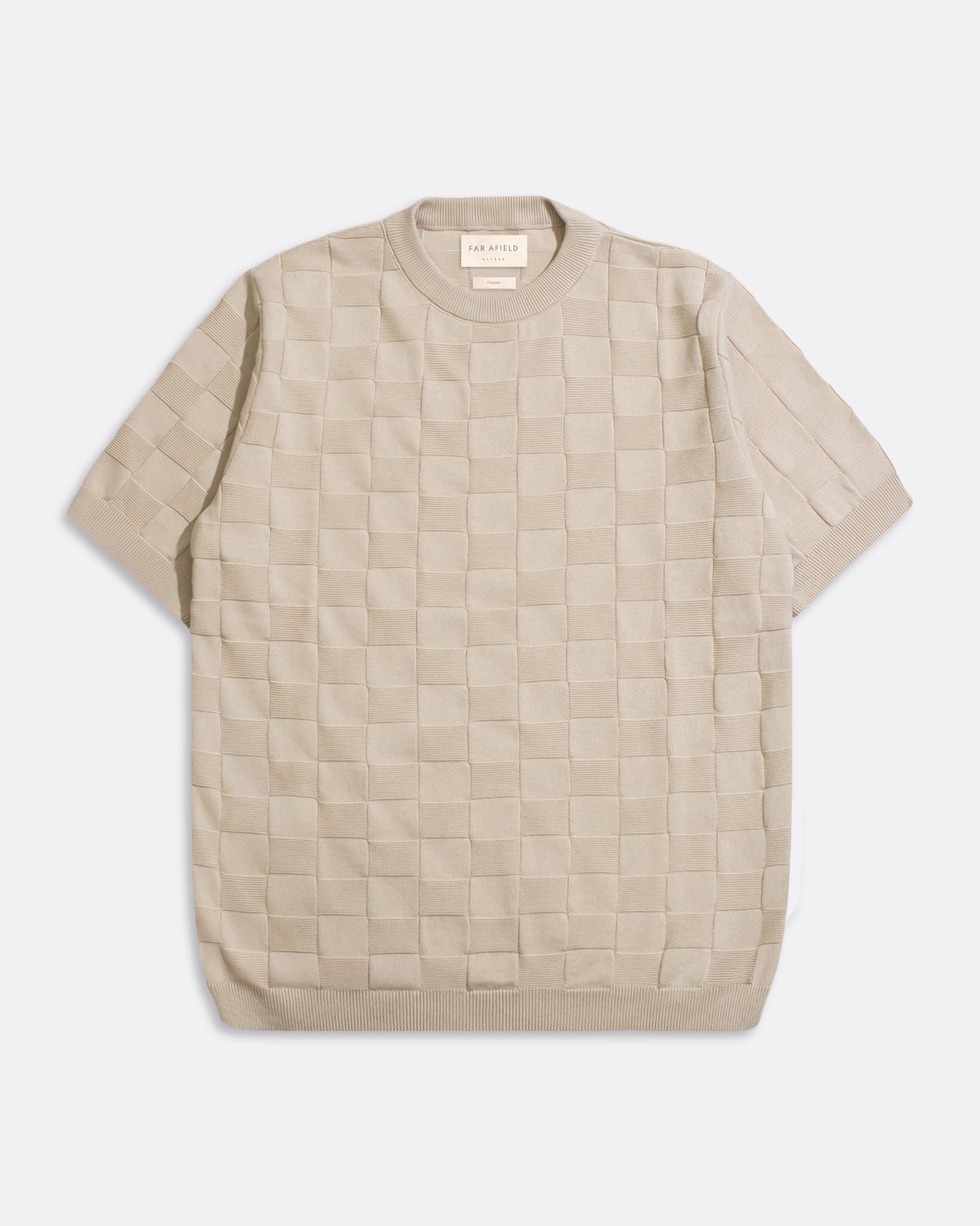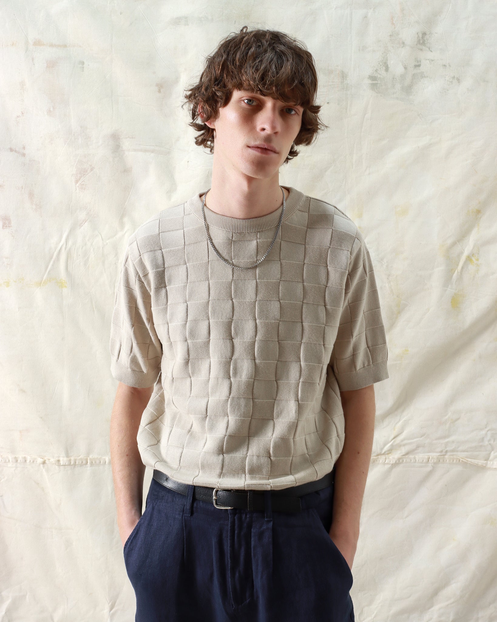 Inspired by a piece worn by a young Caetano Veloso, this knitted t-shirt is crafted from breathable organic cotton with a raised checkerboard texture. Its weight and structure contribute to a clean, refined 1950s-inspired fit.