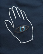 Cut from a dense, Indian basket weave cotton, the Veloso Shirt has a soft handle and relaxed drape. The silhouette is oversized, with dropped shoulders, an open camp collar, and a minimal four-button placket. At the front, two embroidered hand-and-eye motifs add a symbolic focal point – a nod to craft and vision with a graphic language that nods to Oskar Schlemmer’s Bauhaus stage experiments.