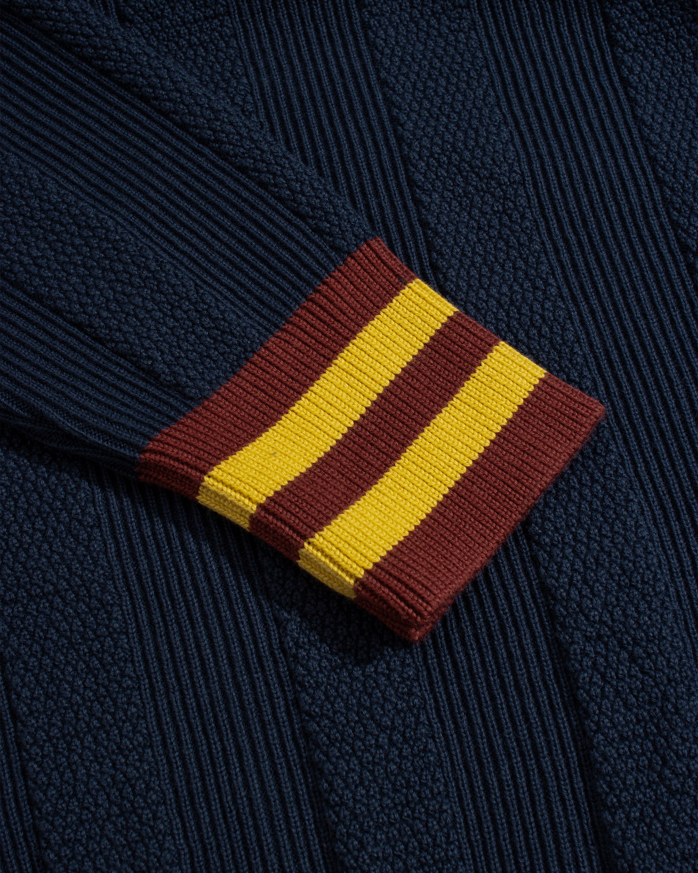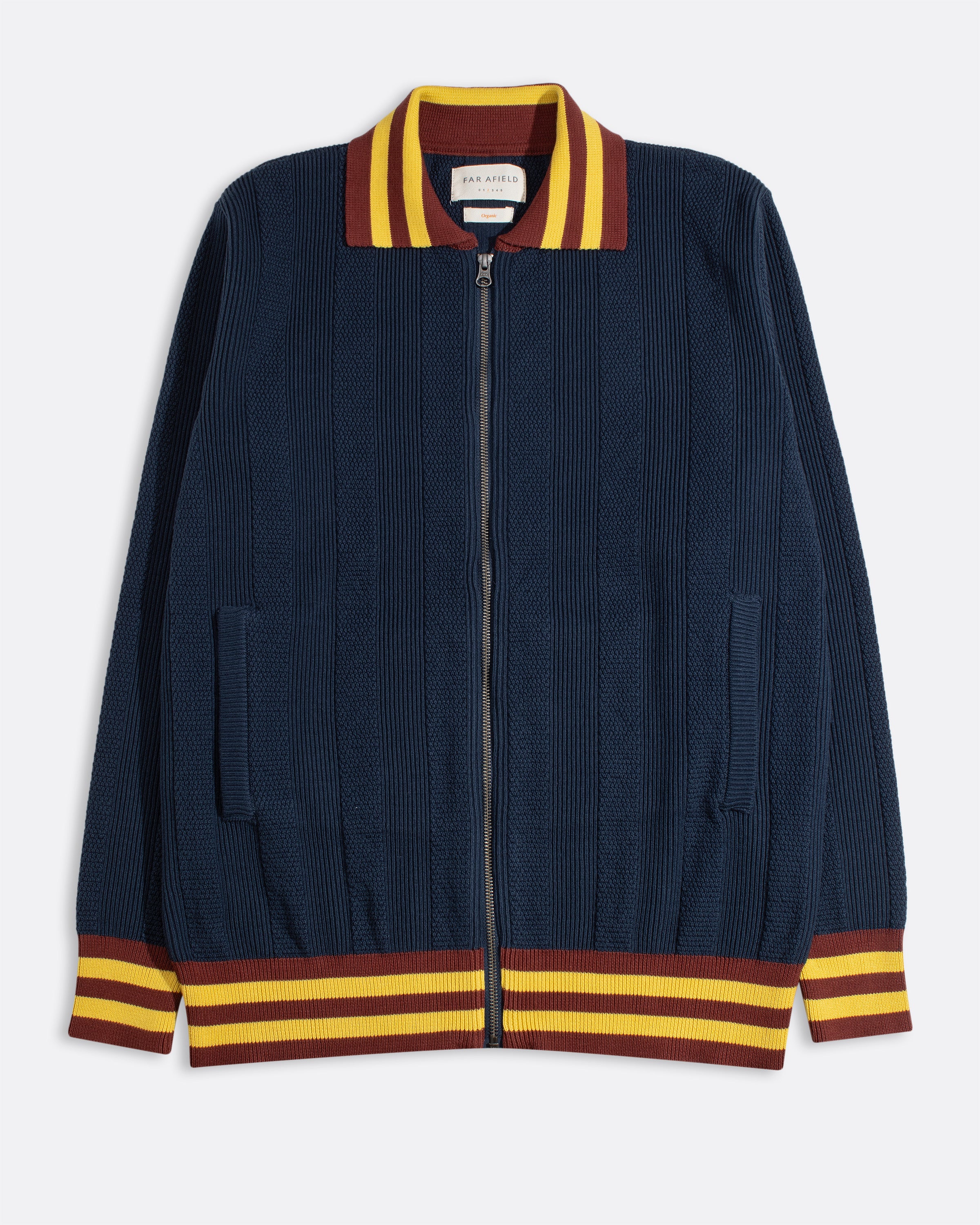 A knitted zip-up inspired by vintage sportswear. Vertical panels alternate between ribbed stripes and a textured purl stitch. Finished with a striped rib collar, cuffs and hem, and a YKK zip through the front.