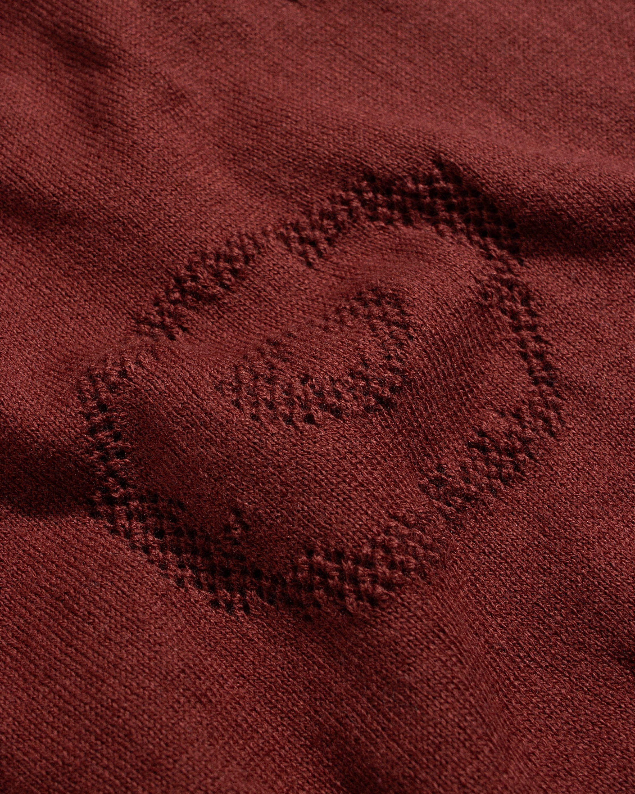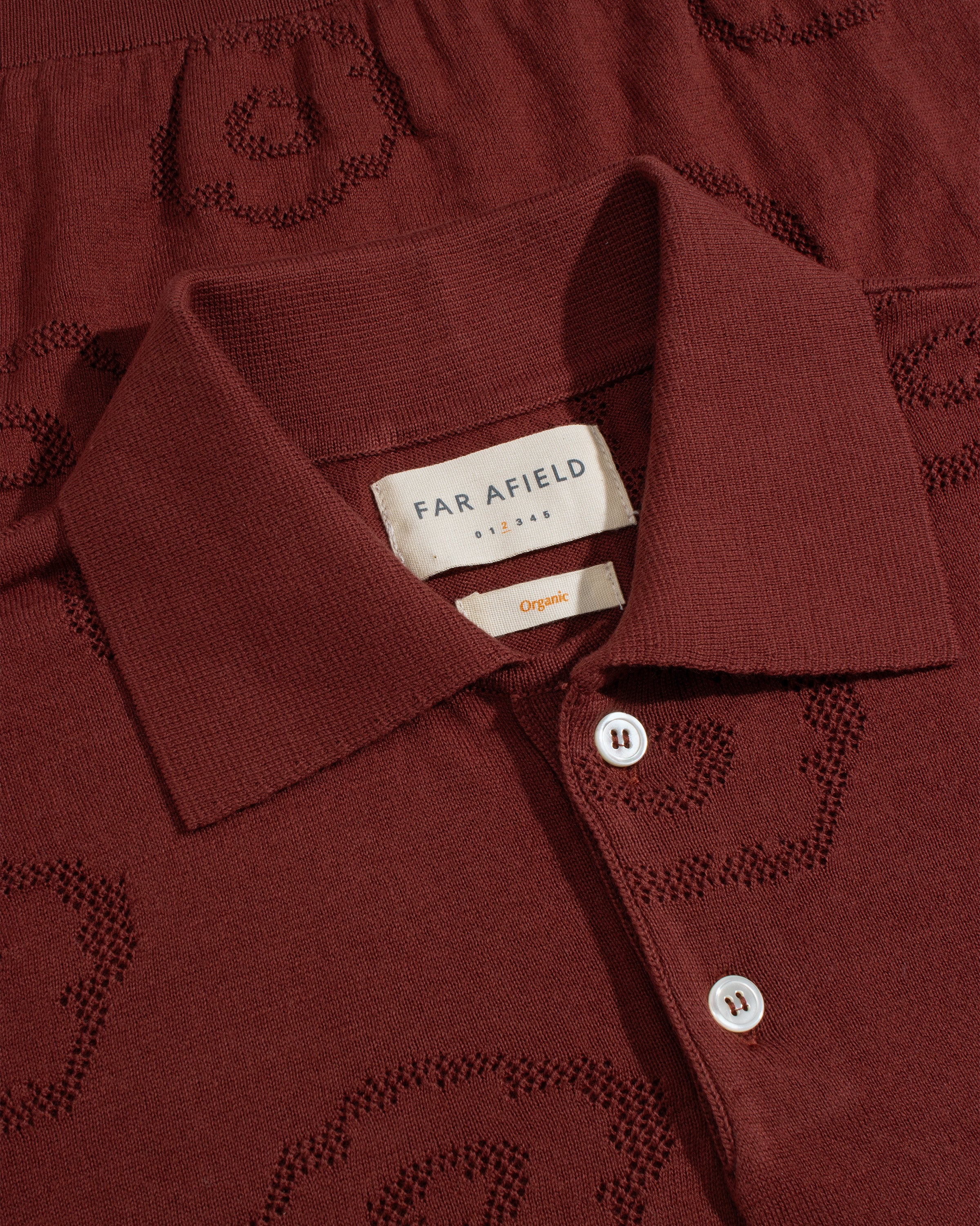 A lightweight knitted polo made in Turkey from organic cotton. The all-over geo-floral motif is built in using a perforated stitch, creating pattern through openwork rather than print.