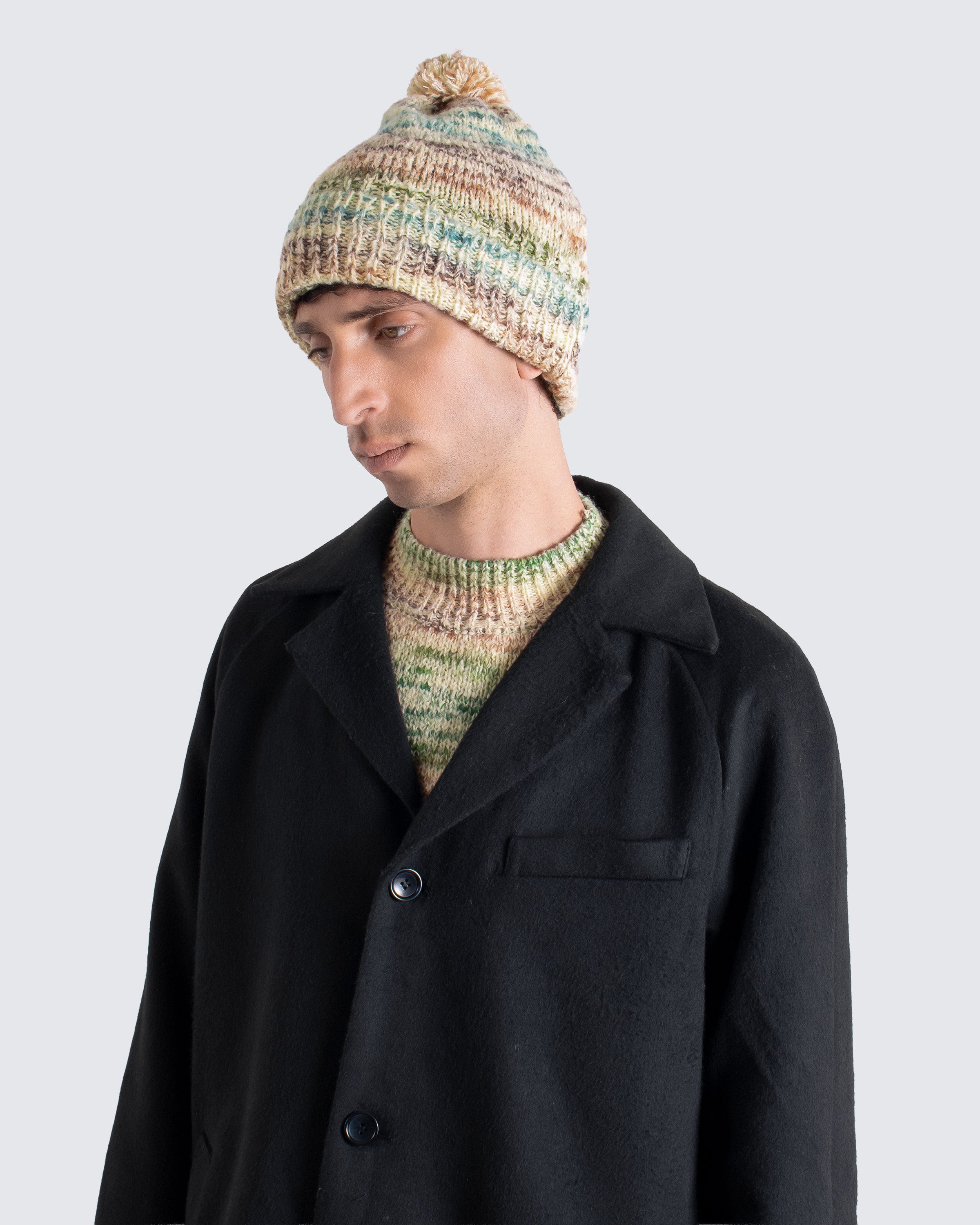 A bobble hat with a lively, irregular mix of tones. The yarns move across the surface in shifting patterns, giving each piece its own character.