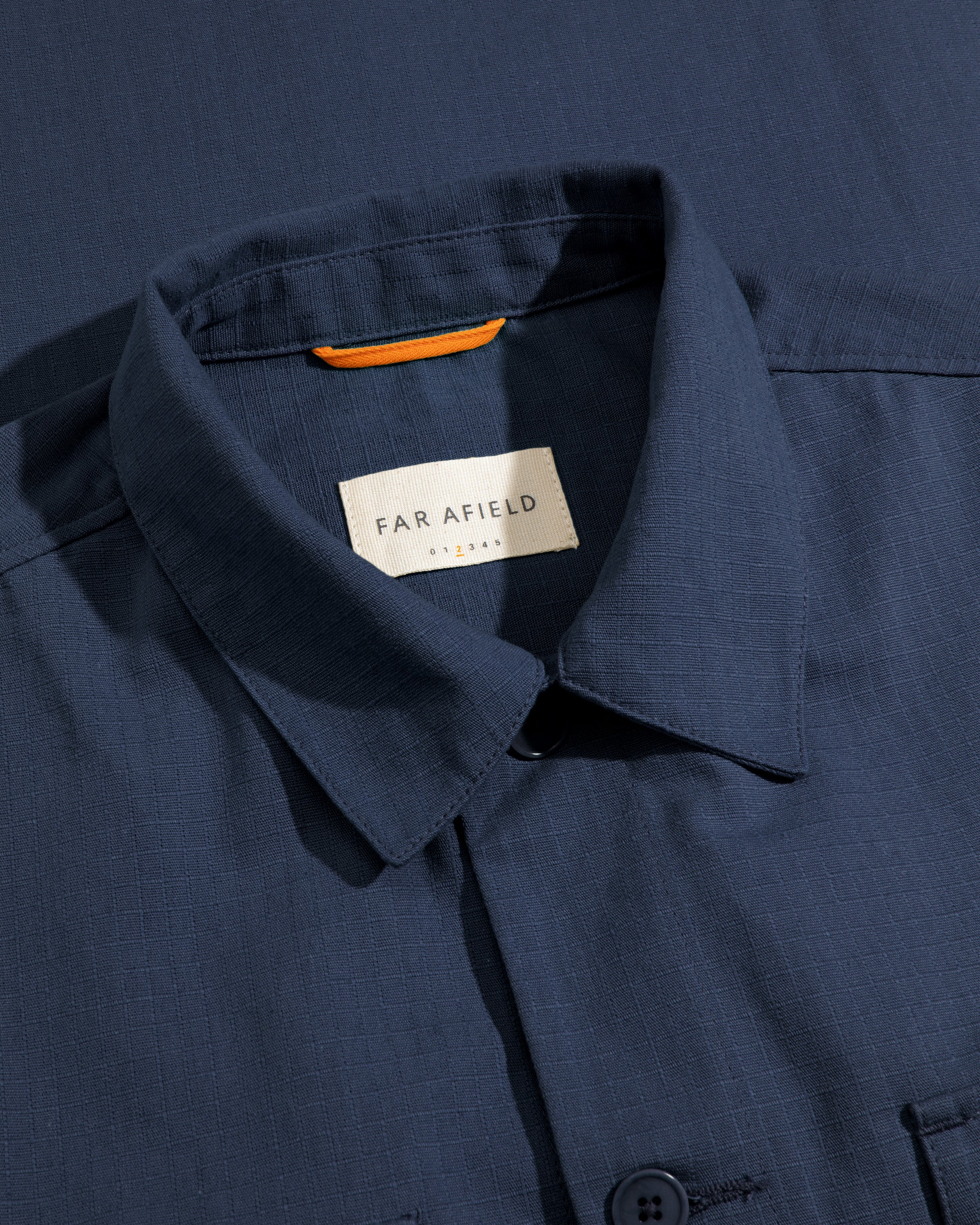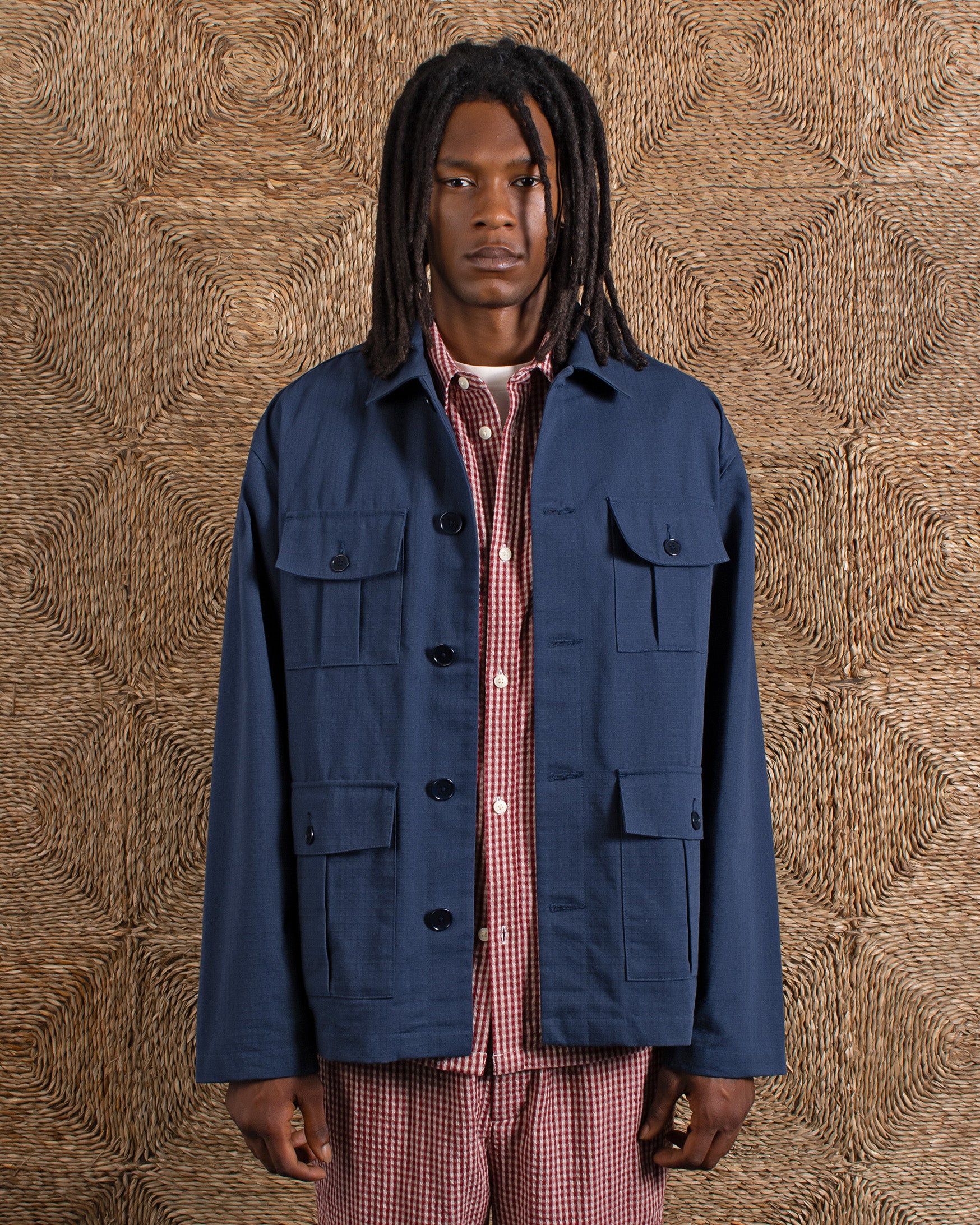 A safari-style jacket cut with a straight, easy fit and a clean button-through front. Made from heavyweight cotton ripstop, with four box-pleated patch pockets and a sharp collar that keeps its shape.