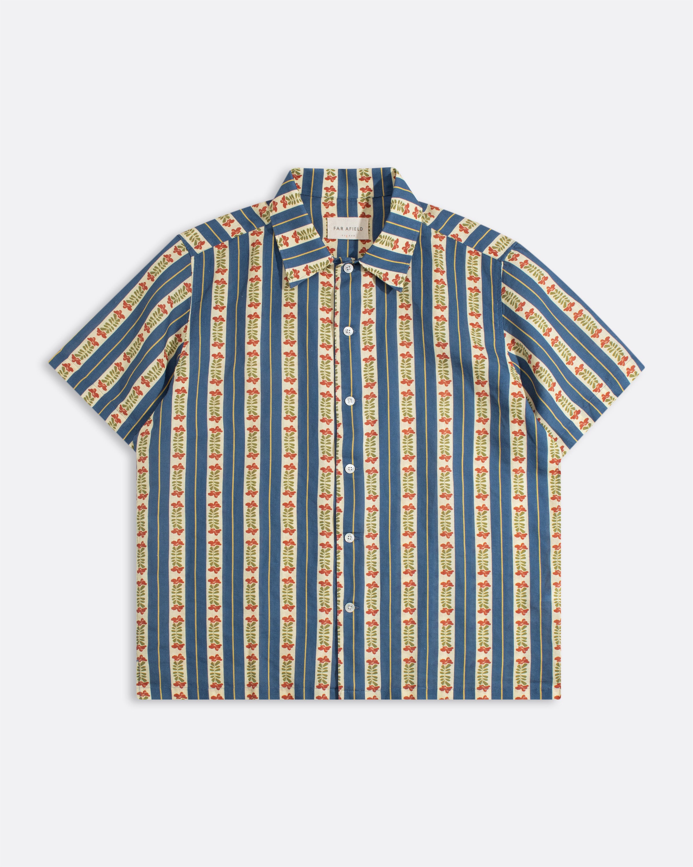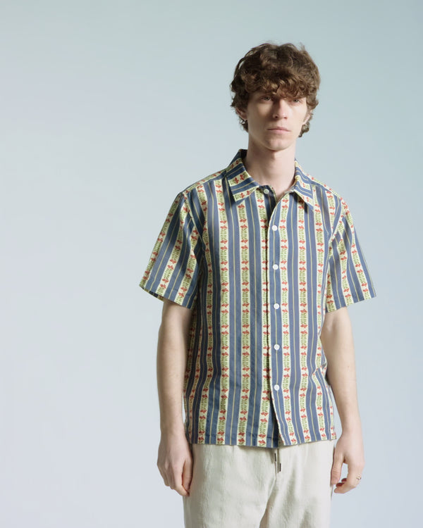 Slightly cropped, boxy short-sleeve shirt in a breathable cotton–linen blend, finished with vertical stripes and delicate tropical floral detailing.