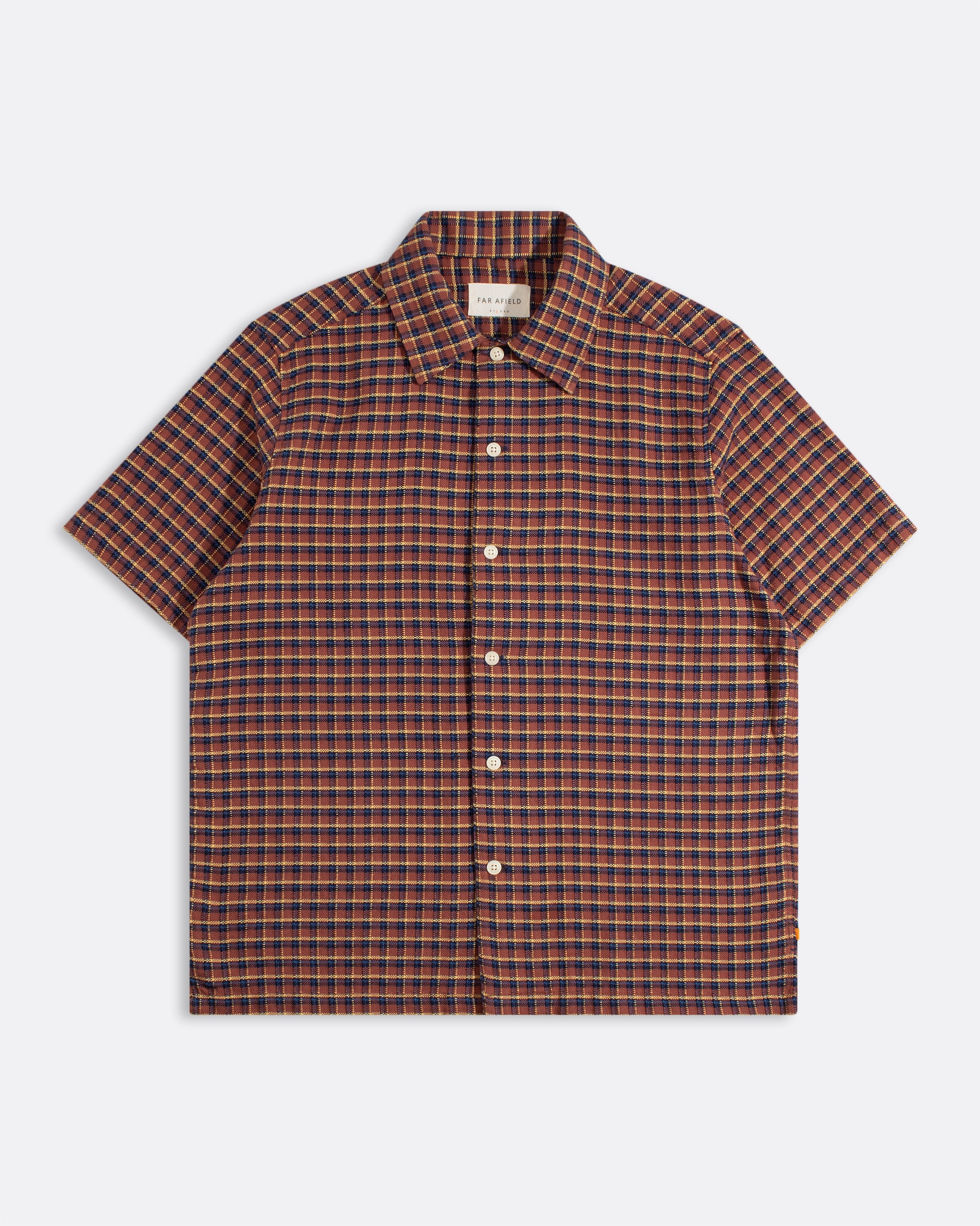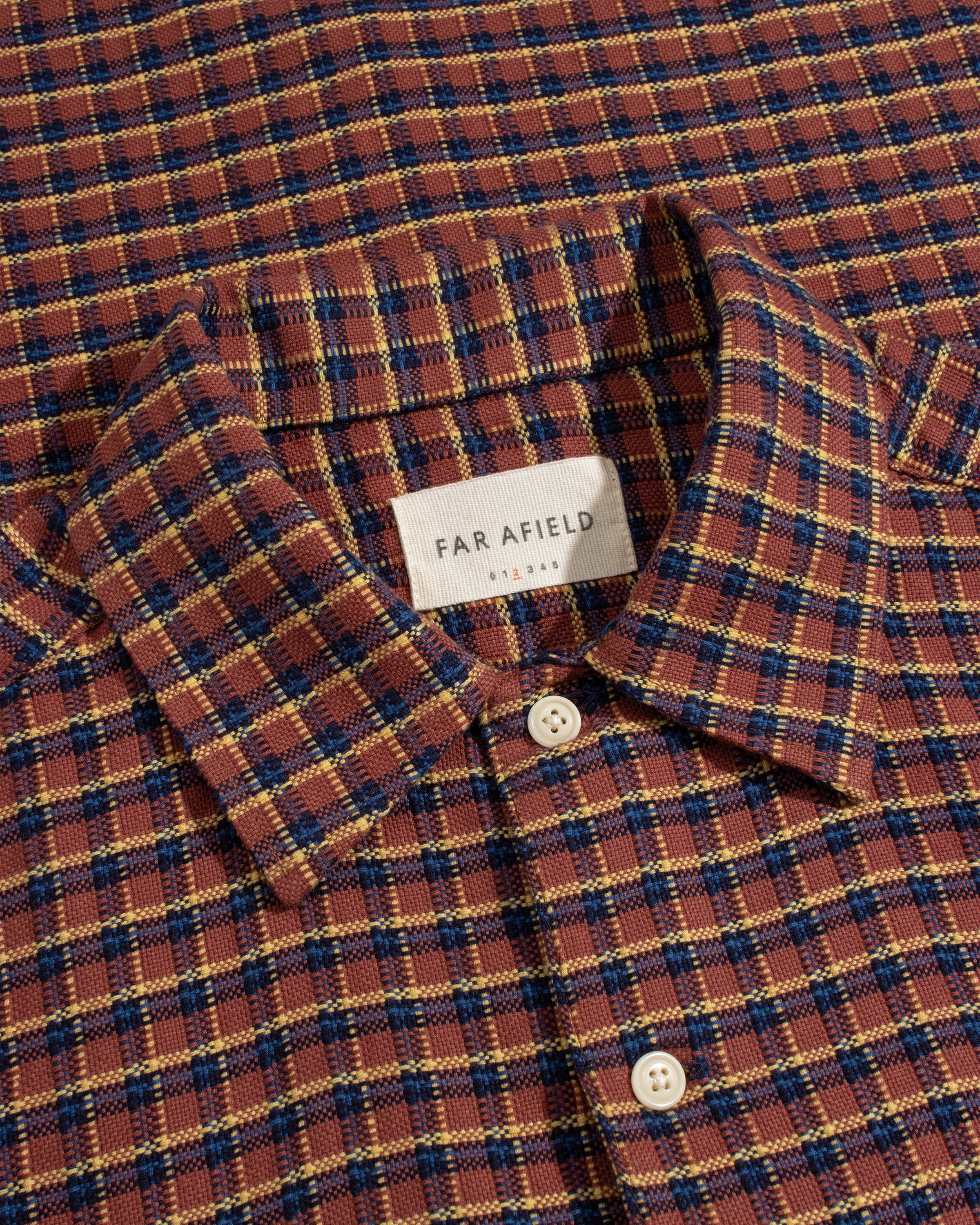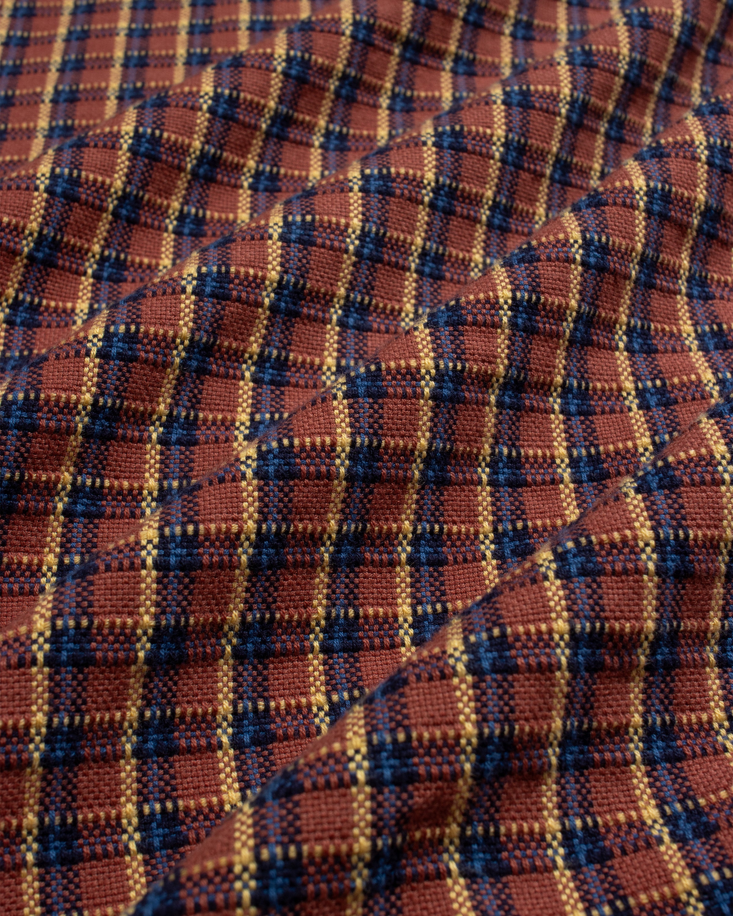 A boxy, slightly cropped shirt cut from dobby-woven cotton, where the check is engineered into the fabric rather than applied. Alternating yarns and float stitches create a lifted grid with visible depth and a lightly open feel.