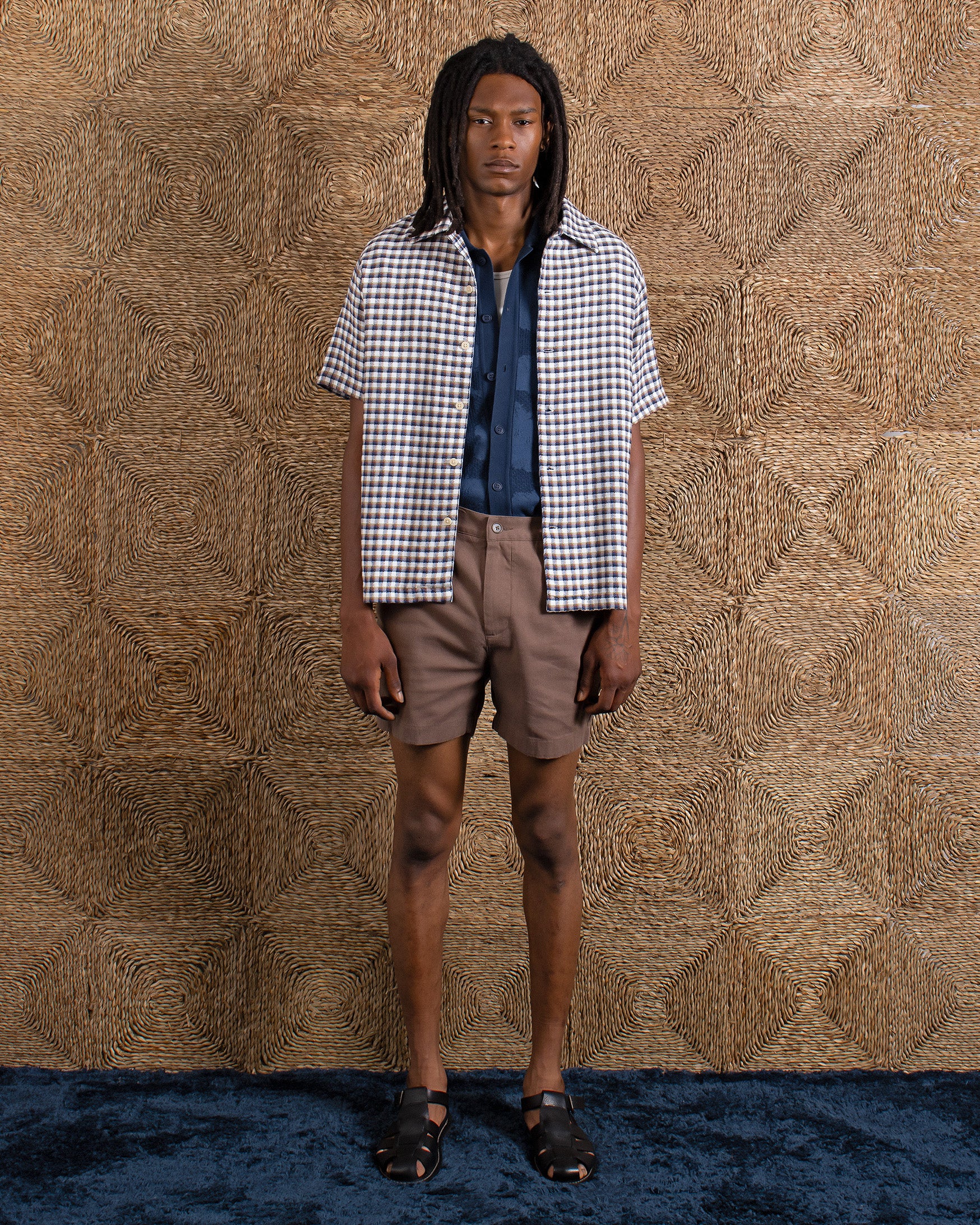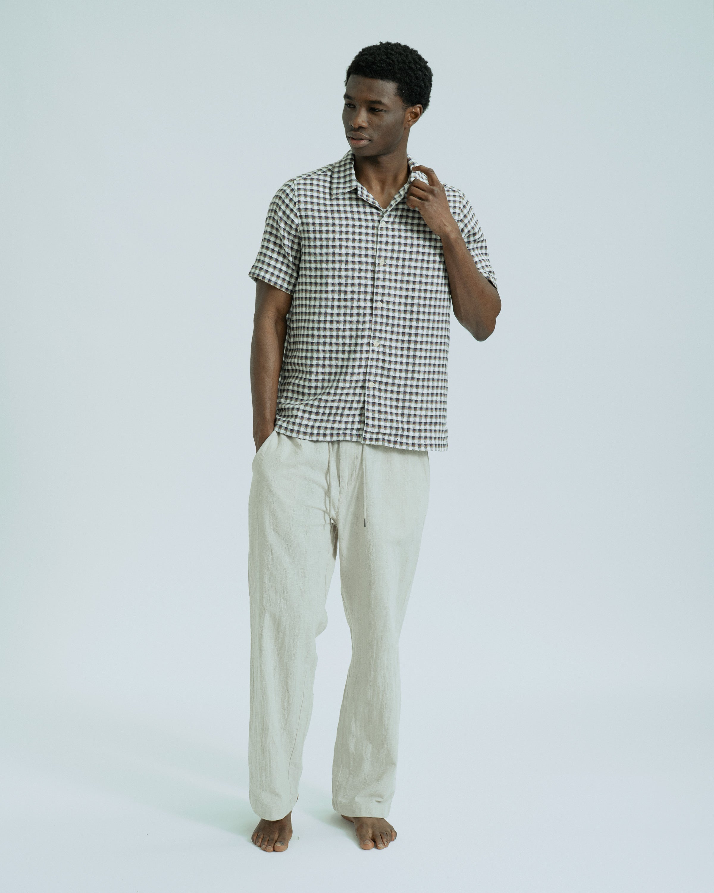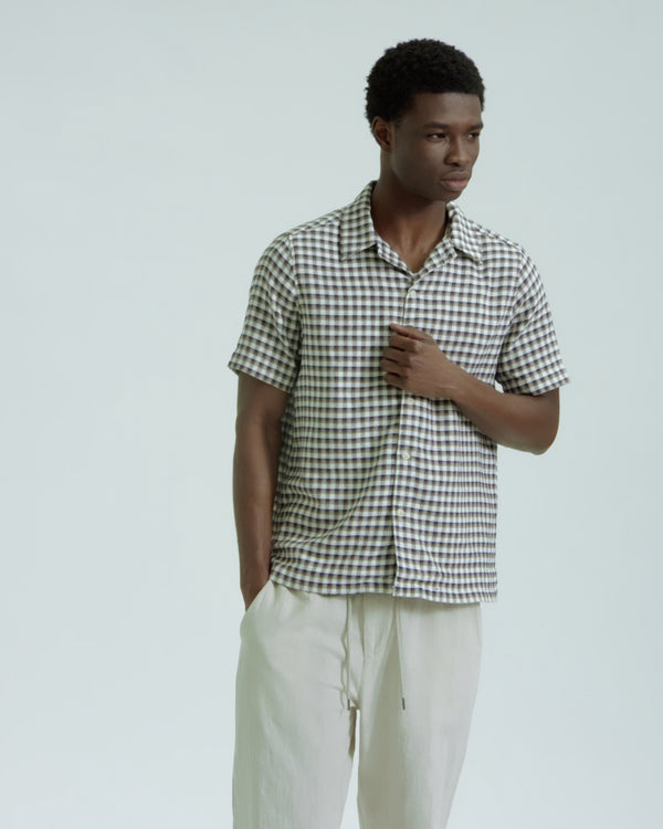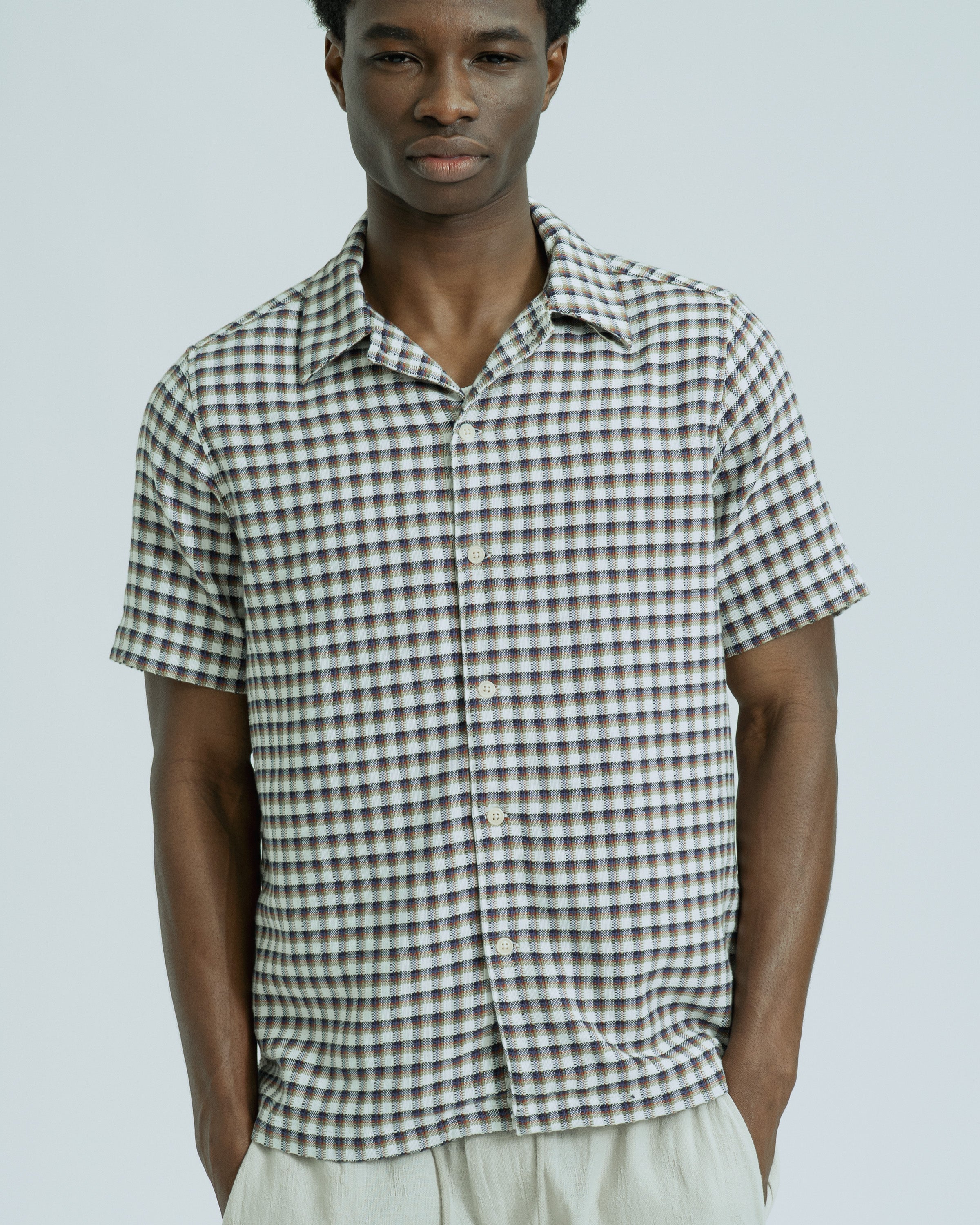 A boxy, slightly cropped shirt cut from dobby-woven cotton, where the check is engineered into the fabric rather than applied. Alternating yarns and float stitches create a lifted grid with visible depth and a lightly open feel.