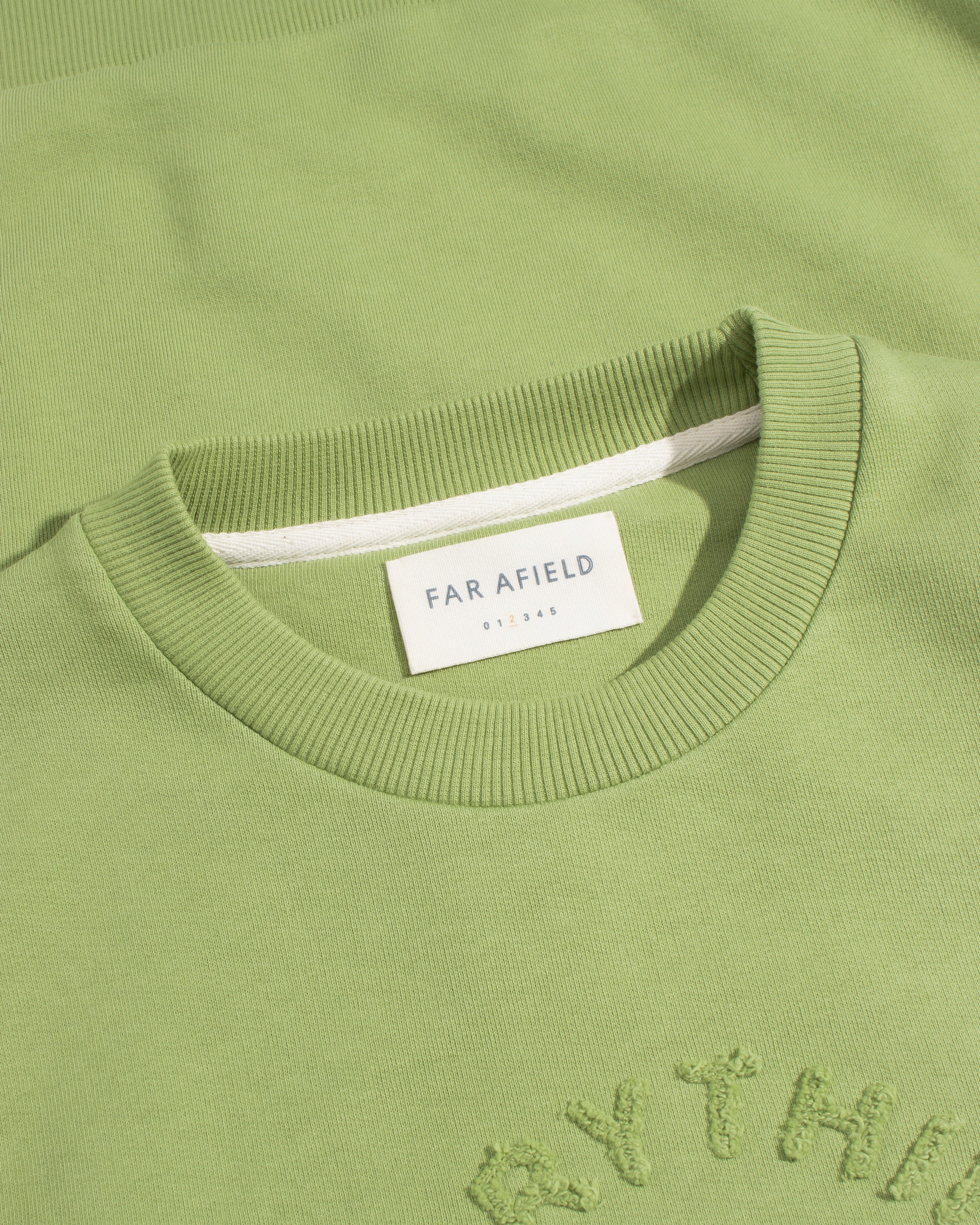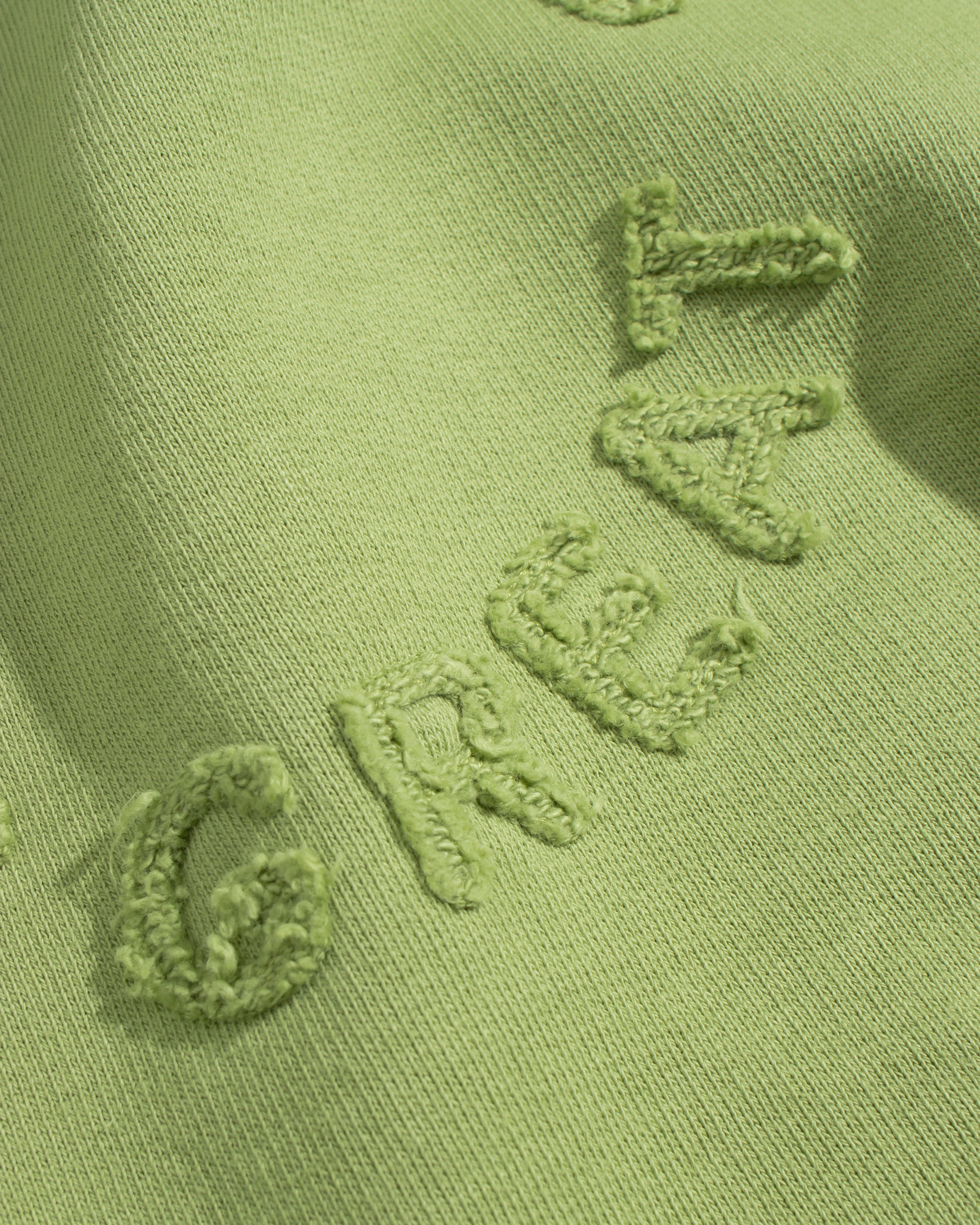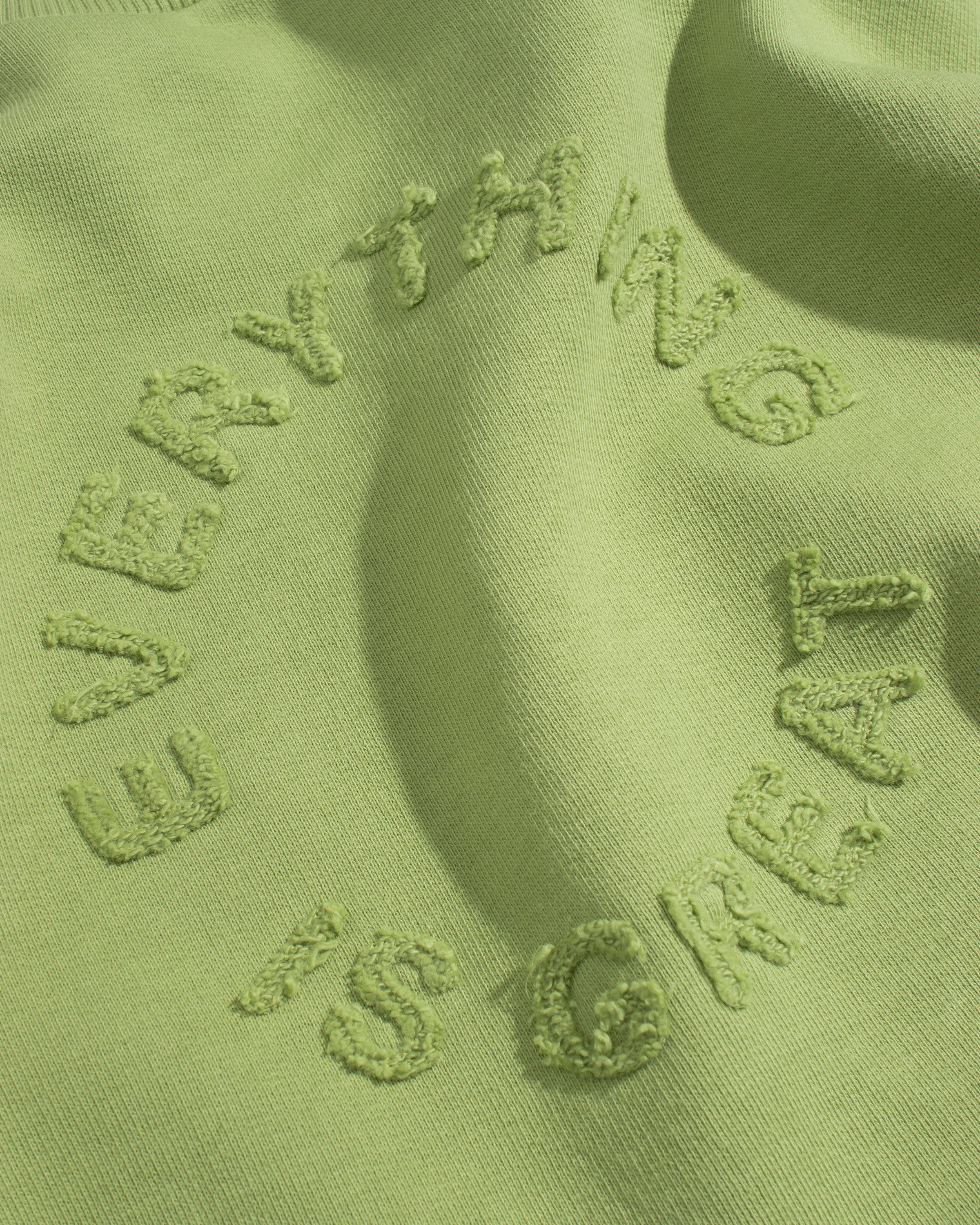 A classic crew sweatshirt cut from garment-dyed organic cotton loopback. The colour has that softly lived-in look from day one, with natural variation in tone that will keep mellowing with wear and washing. Finished with tonal looped bouclé embroidery reading “Everything Is Great” across the chest.