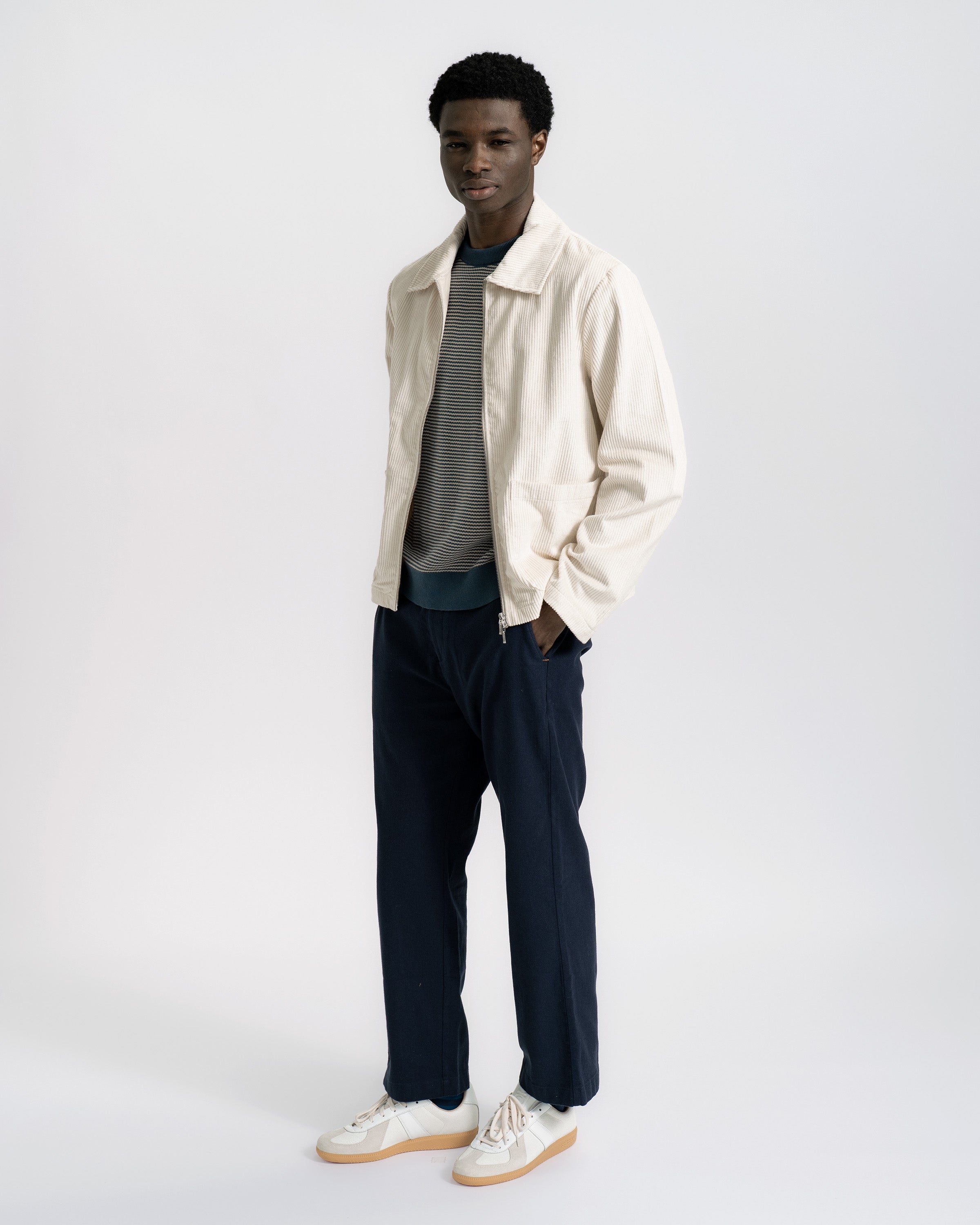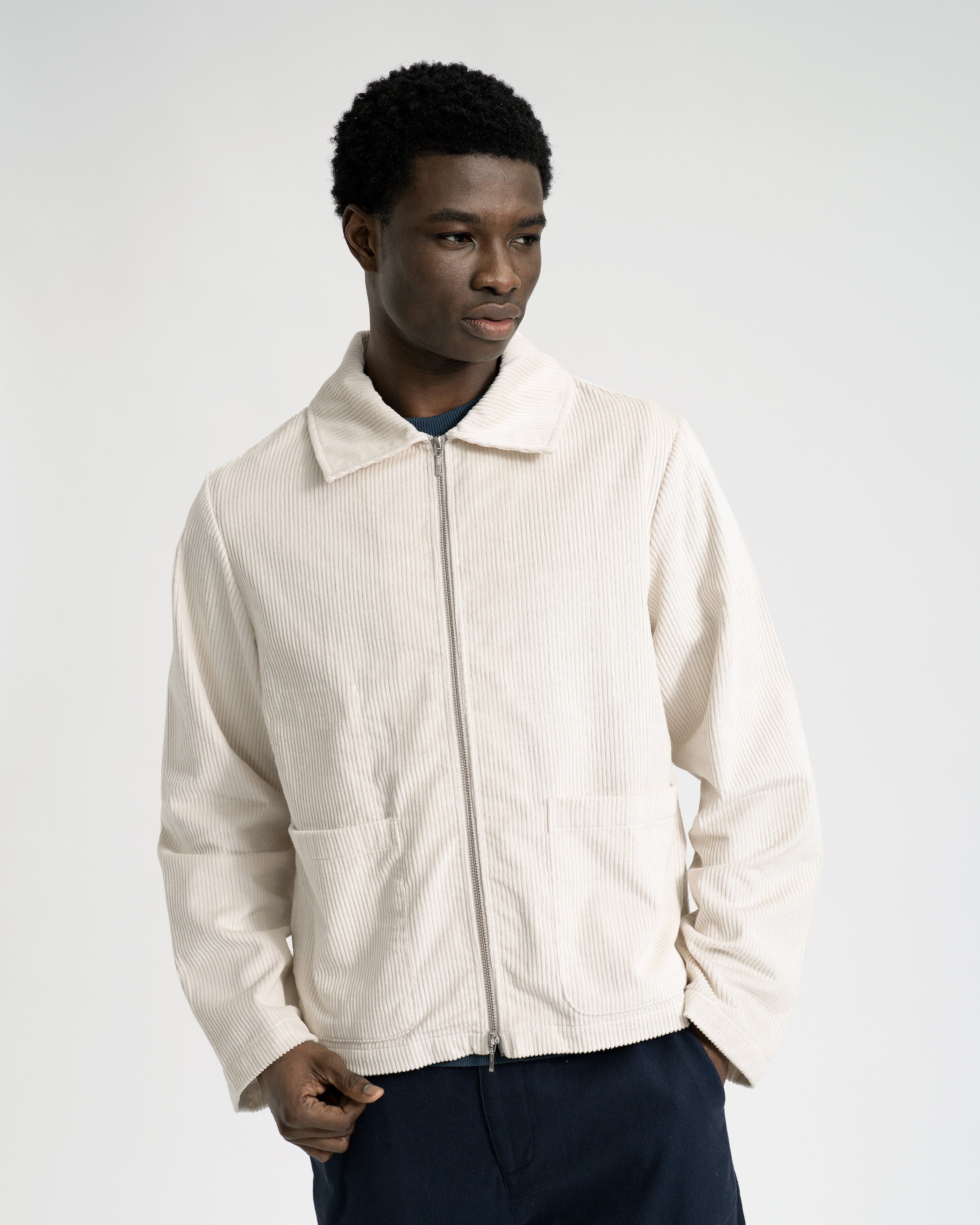 A zip-through jacket with a sharp collar, straight hem, and a relaxed fit that sits cleanly through the body. Cut from 4.5-wale cotton corduroy with a soft pile and rich handle, it’s an easy outer layer with just enough structure. Finished with a two-way zip, two patch pockets at the waist, and an internal pocket.
