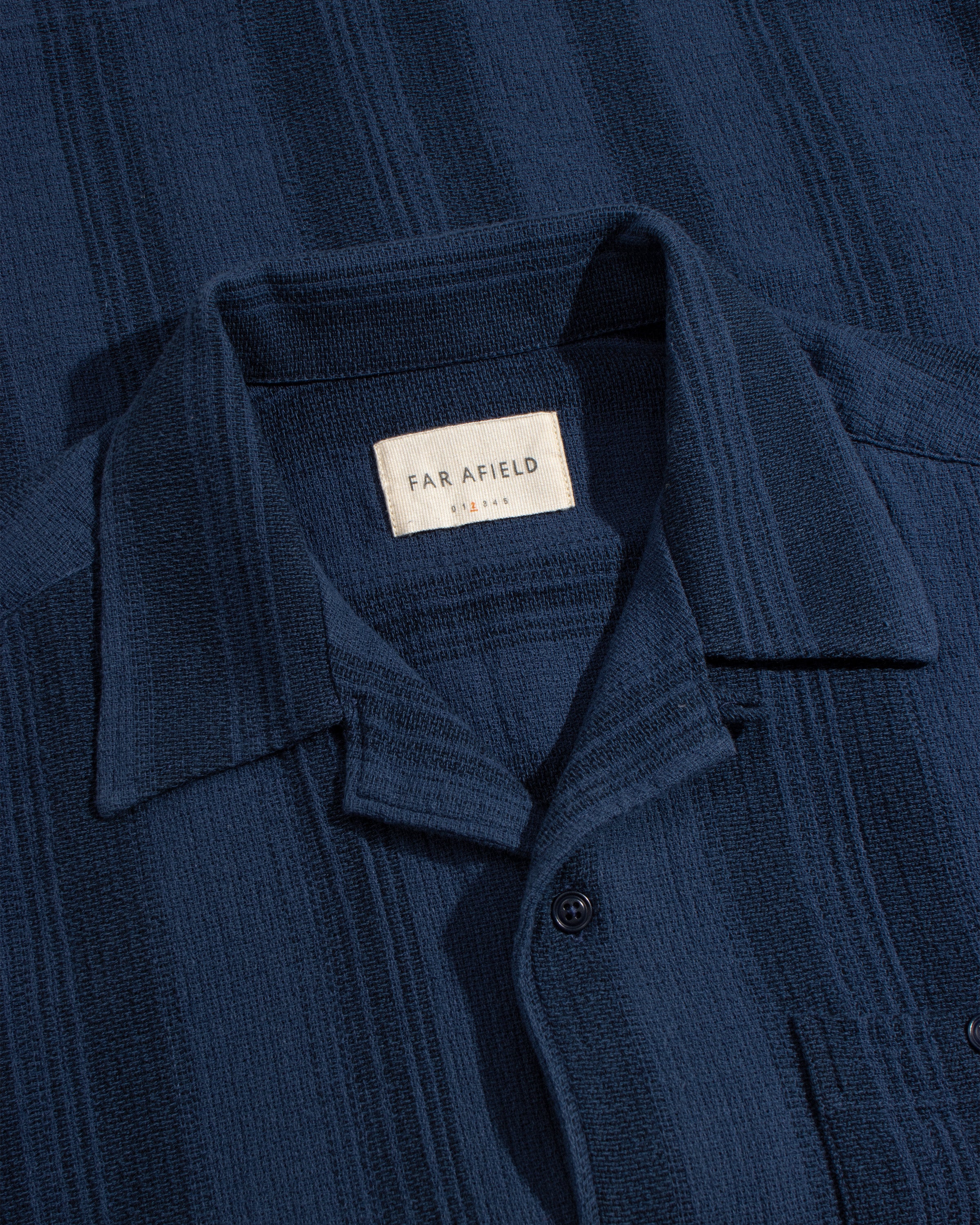 A relaxed open-collar shirt with an adjustable collar and a buttoned chest pocket. Cut from a slubbed cotton weave with a slightly open, towelling-like handle and dobby-woven stripes.