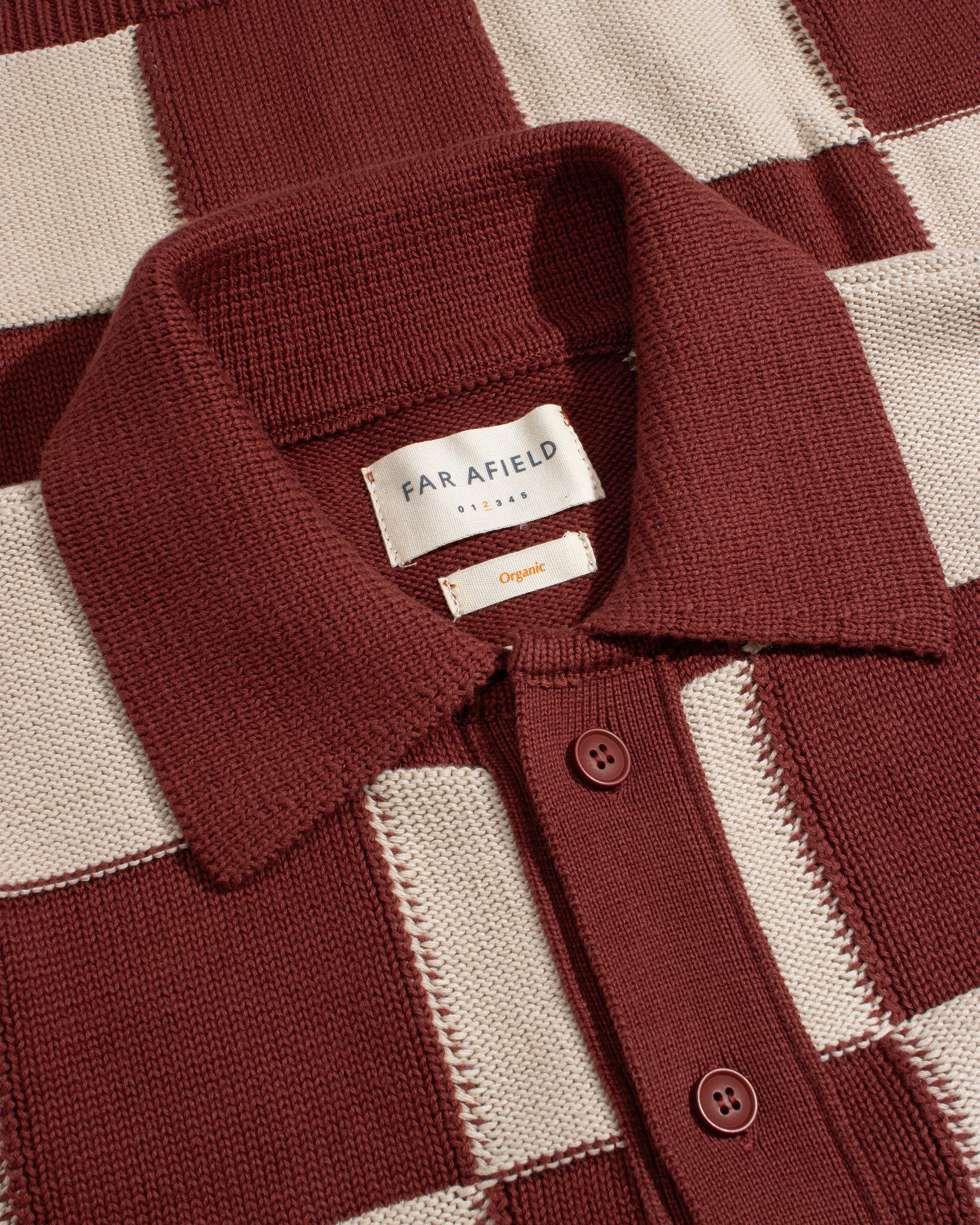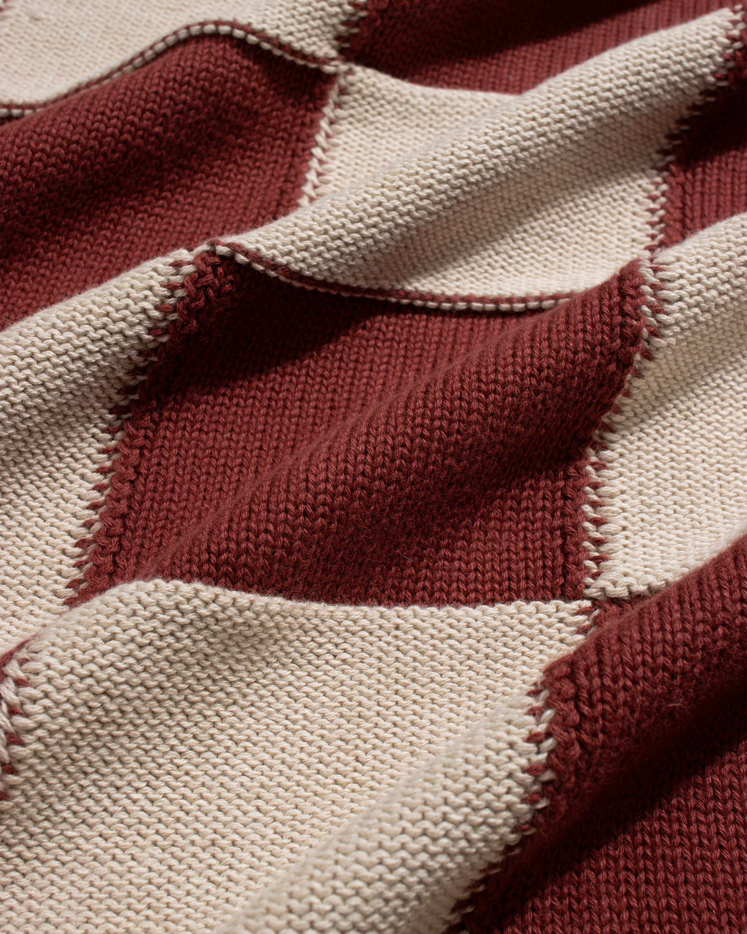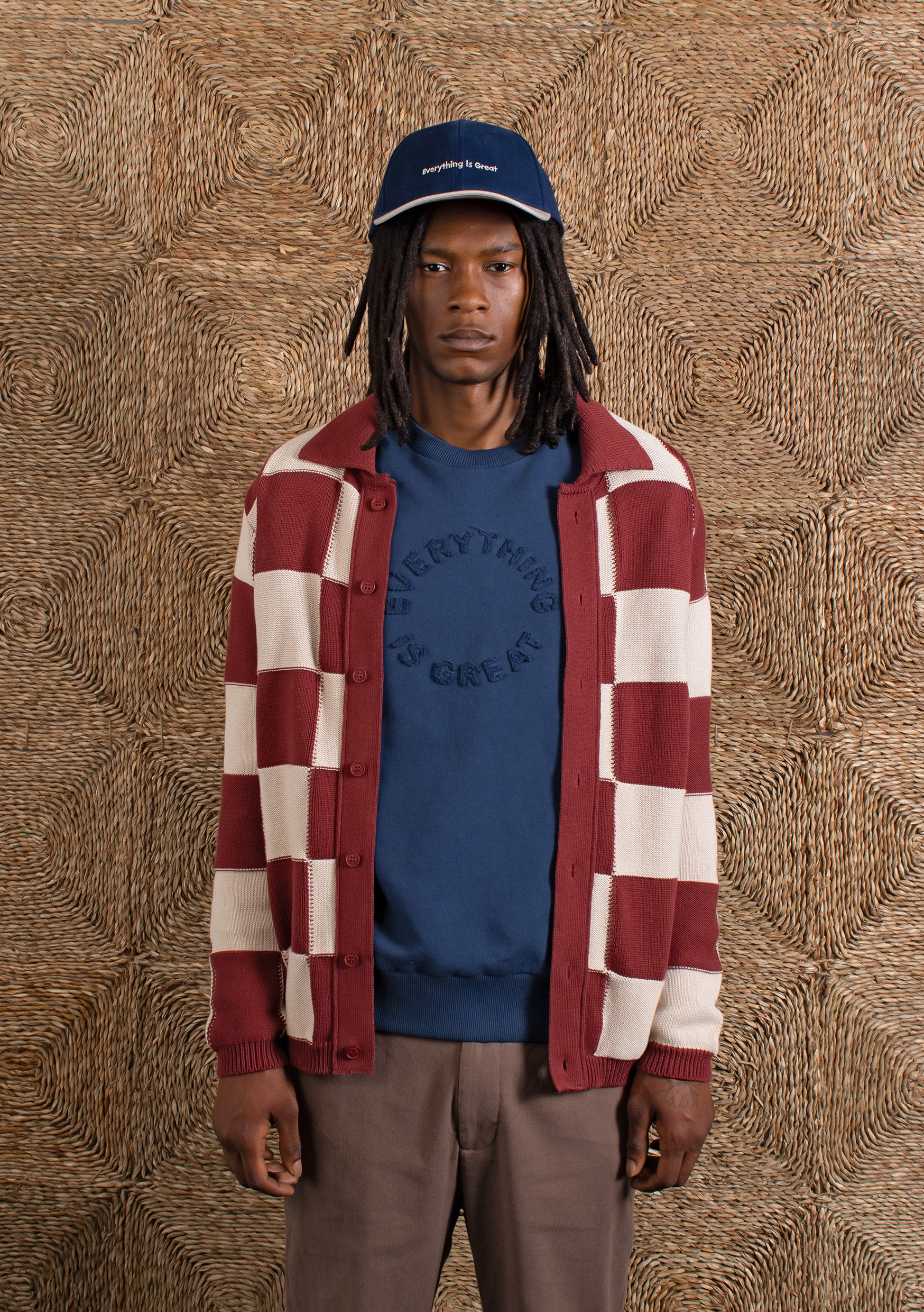 A long-sleeve knitted shirt constructed using alternating knit panels to create a checkerboard patchwork effect. Cut with a relaxed, boxy fit and finished with a button-through front. Made in Turkey from locally sourced organic cotton.